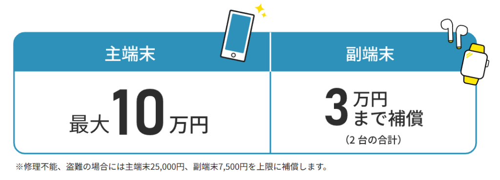 メイン端末(主端末)は年間10万円まで補償されますが、イヤホンやタブレットなどの副端末は年間3万円までが上限です。