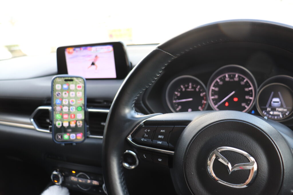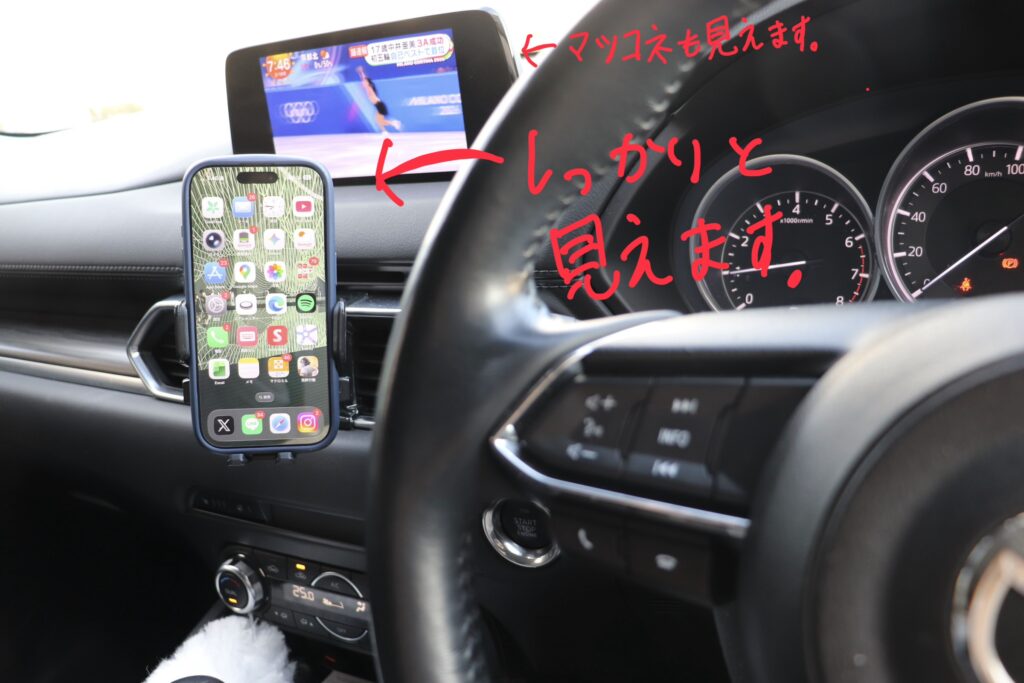 CX-5のマツダコネクト(モニター)を遮らない絶妙な高さにスマホが来ます。(横向きにするとなおよいです!)