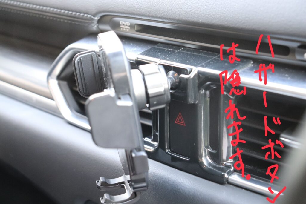 専用設計なので、ハザードボタンを囲う形になっています。ボタン自体は奥にありますが、指を入れるスペースは十分に確保されており、緊急時の操作も問題ありませんでした。